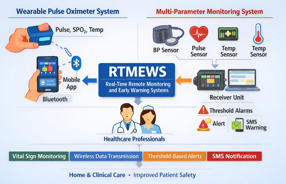 Monitoring patients' vital signs such as pulse, body temperature, systolic-diastolic blood pressure, and SpO₂ plays a significant role in healthcare systems for post-operative patients, emergencies, infants, individuals with heart failure, pandemics, and similar situations. In this study, two different real-time remote monitoring and early warning systems (RTMEWS) are proposed to assist healthcare professionals and physicians in measuring and monitoring patients' vital signs. In the first proposed RTMEWS, SpO₂, pulse, and body temperature can be measured using a pulse oximeter developed with an ATMEGA328P microcontroller and MAX30100 sensor, and monitored via wireless transmission from the OLED GLCD screen on the prototype through an interface developed with the MIT2 application on a smartphone. In the second proposed system, when the measured pulse rate, body temperature, and systolic-diastolic blood pressure findings exceed the threshold range determined by the physician, a warning message can be sent to the mobile phone of the healthcare worker, doctor, or desired recipient via an MC35i terminal (GSM/GPRS modem) controlled by an AT command set connected to the computer where the data is stored. In conclusion, many factors influence the determination of normal and abnormal ranges of vital signs and intervention priorities. When unforeseen situations arise in clinical care processes, RTMEWS has been shown to assist professional interventions by generating timely alarms. The system provides a foundation for clinical decision support systems by offering real-time remote monitoring and autonomous threshold-based alerts.